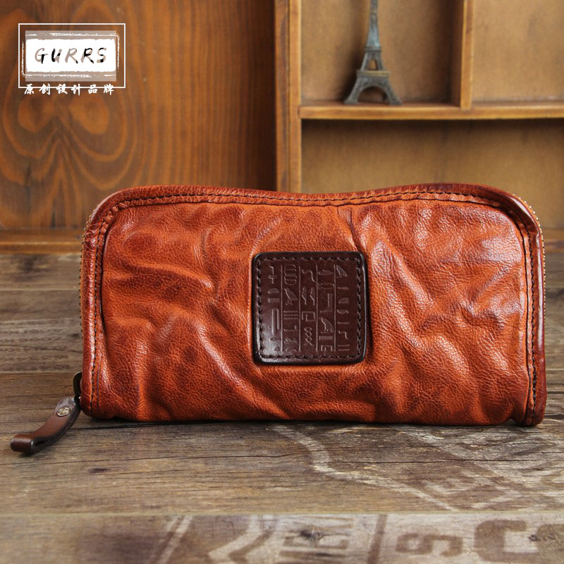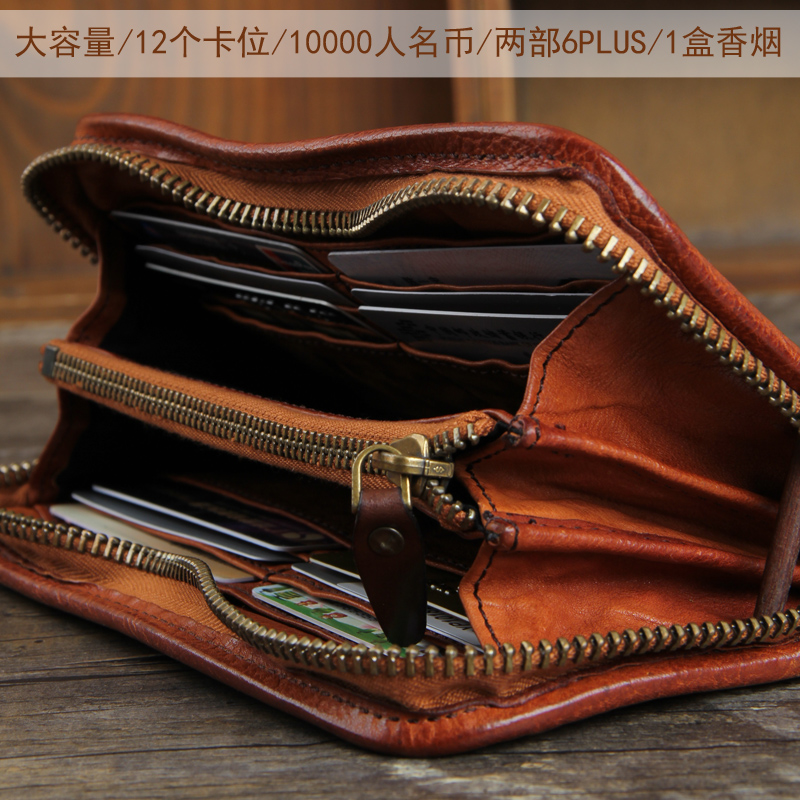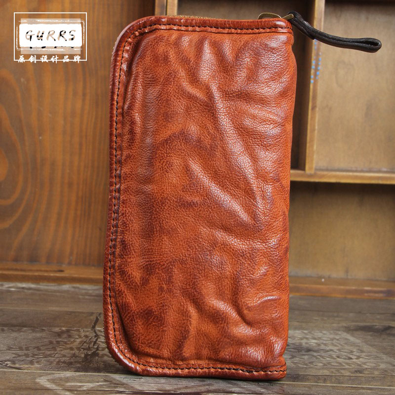 Original new retro handmade men's wallet Soft bull leather Long version mobile phone bag Bracelet Hands bag Men's Folds Wallet