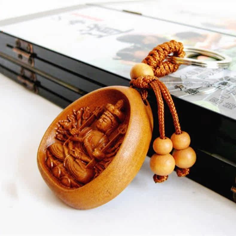 Peach wood engraving Thousand hands Guanyin Bodhisattva key buckle car pendant raw shooter's safe and auspicious gift hanging decoration