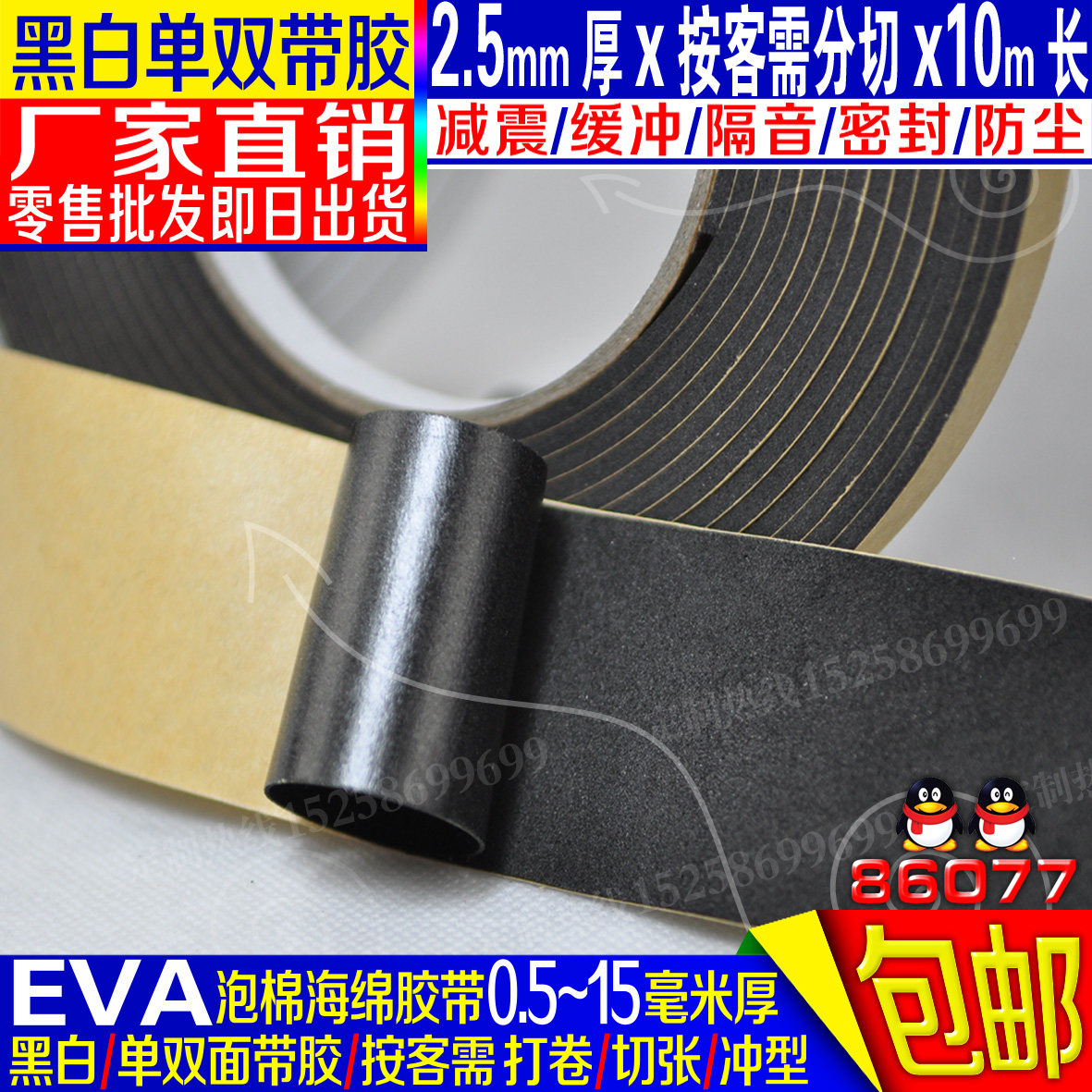 2 5mm thick 5cm 5cm 10m long black single-sided EVA foam sponge adhesive tape shockproof crossbar seal promotion