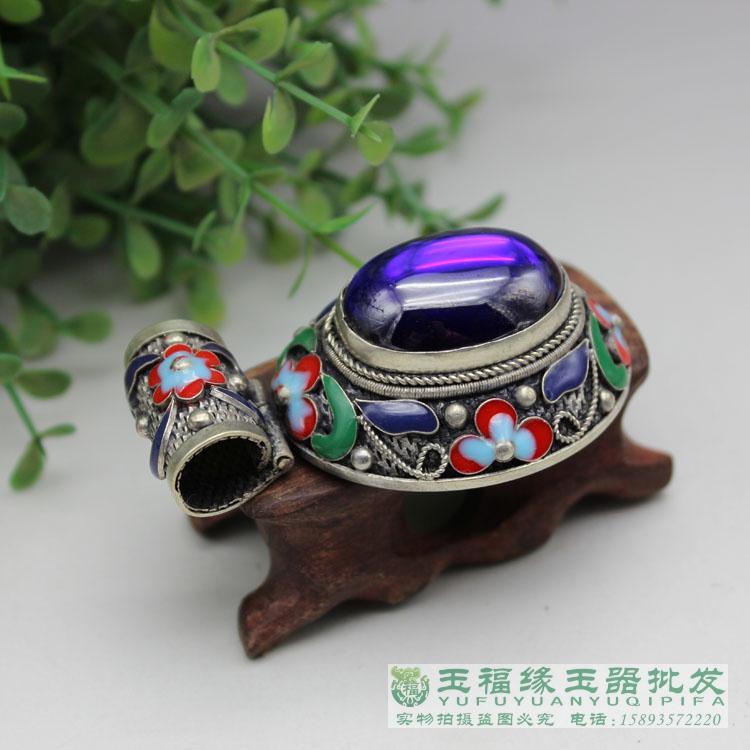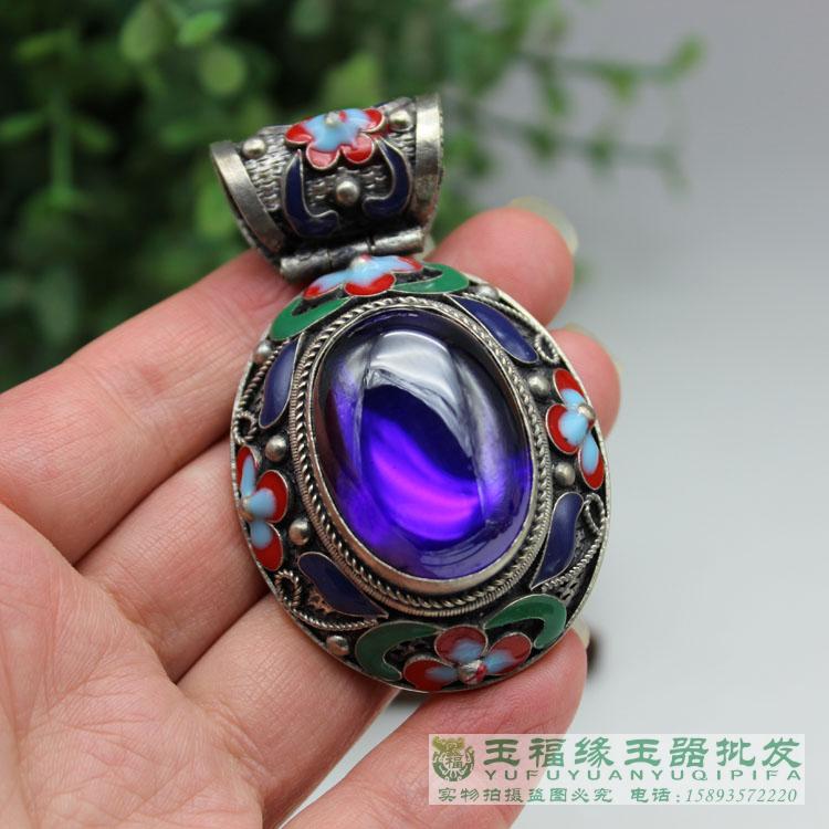 Antique miscellaneous collection Foot silver baked blue cloisonne inlaid with blue zircon pendant Pendant accessories
