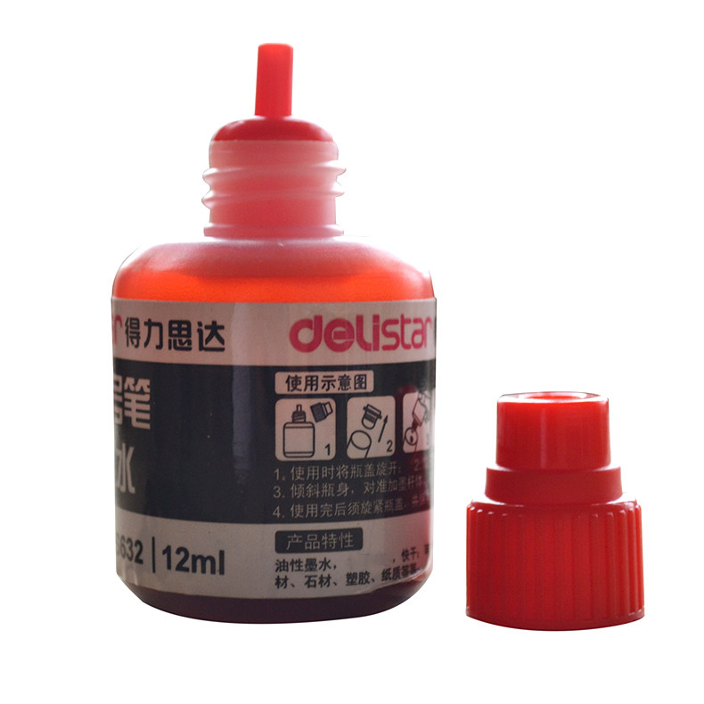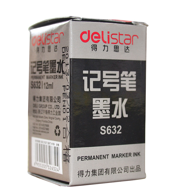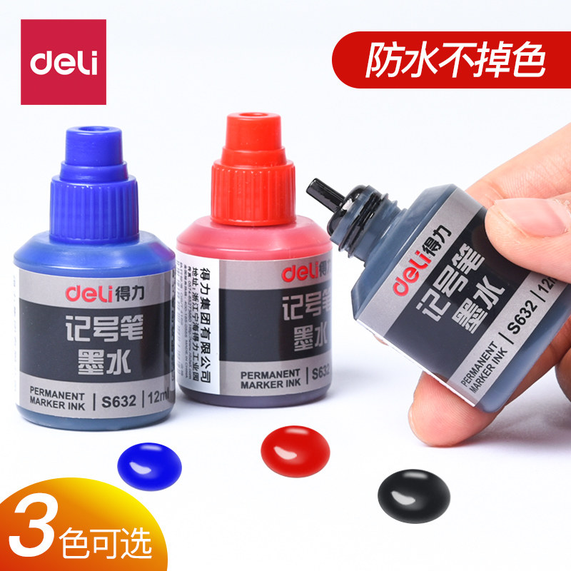 Deli 6 bottles of 12ml ink oily pen refill liquid S632 non-erasable logistics packaging pen add water Black red blue Kiwi pen water wholesale ink marker pen ink