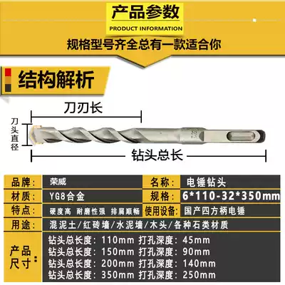 Roewe Hugong drill bit square handle electric hammer drill bit two pit two groove round handle impact Wall cement concrete construction drill