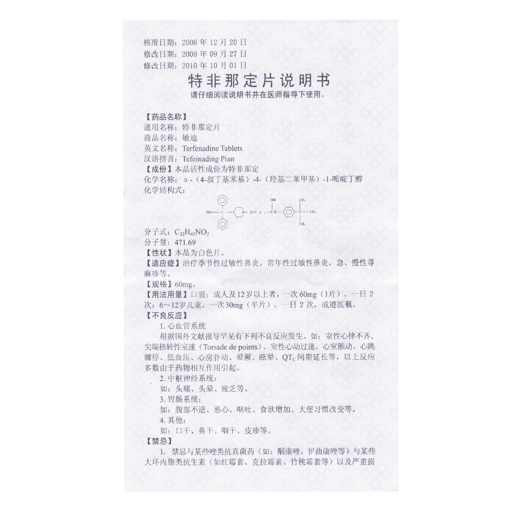 Mindy Mindy Terfenadine Tablets 60mg*12 Boxes Seasonal Perennial Allergic Rhinitis Acute and Chronic Urticaria
