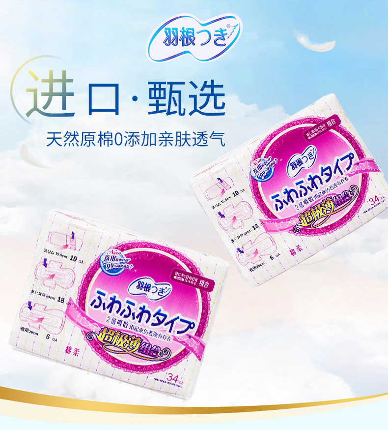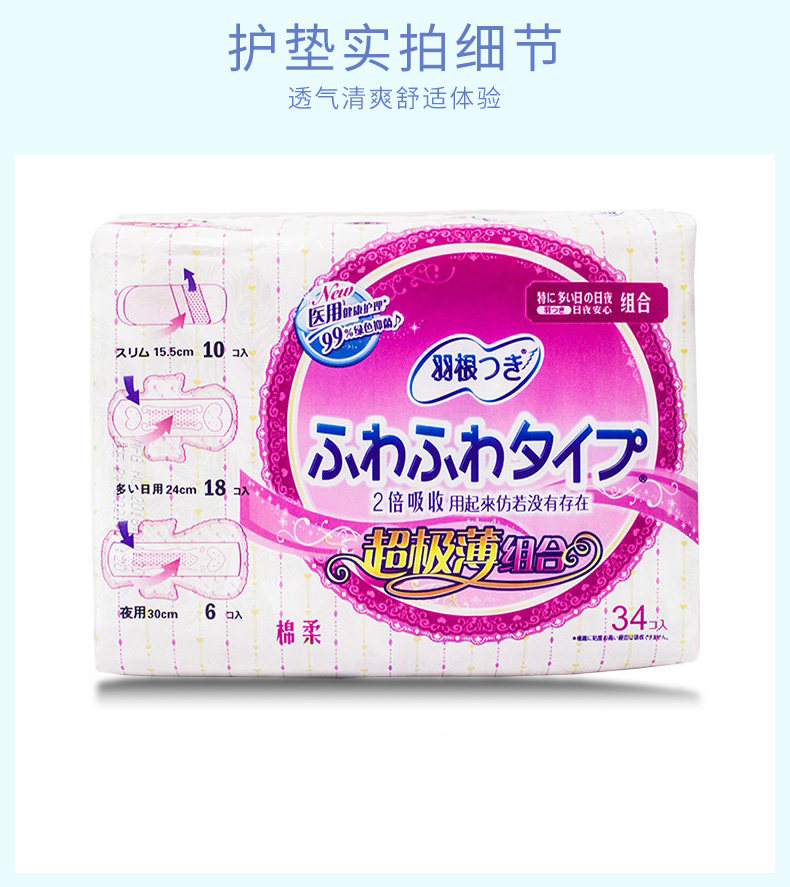 Japan imported feather root skin-friendly cotton surface silk thin combination 34 pieces of sanitary napkin pad daily use 24CM night 30CM