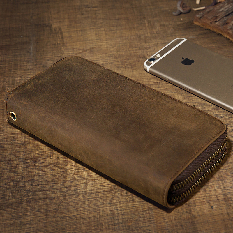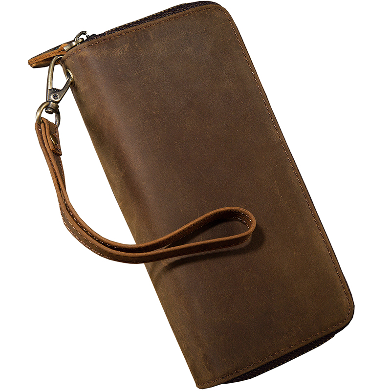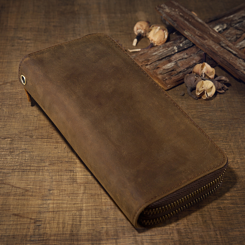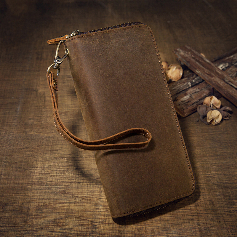 Original insane horse leather long version double pull chain wallet men multi-position cow leather retro hand bag genuine leather large capacity