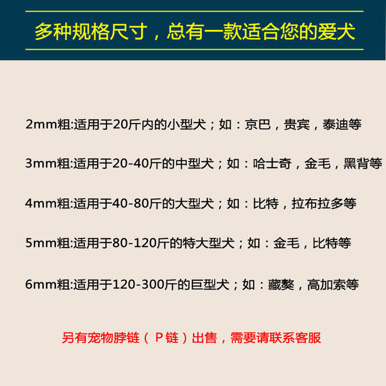 Wire diameter 2MM thick Suitable for small dog wire diameter 3MM thick Suitable for medium dog wire diameter 4MM thick Suitable for medium and large dog wire diameter 5MM thick Suitable for large dog wire diameter 6MM thick Suitable for oversized