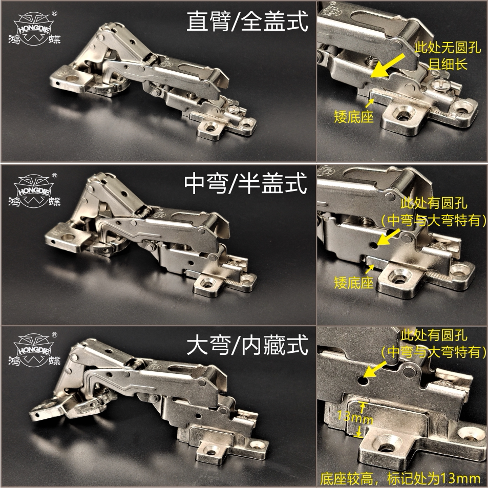 Hinge Big Bend-Built-in Type Only Hinge Middle Bend-Half Cover Type Only Hinge Straight Arm-Full Cover Type Only 2 Alloy Bases