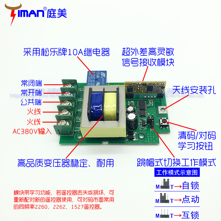 Control high power three-phase 380V motor motor sprinkler wireless remote control switch one tug 2-way learning type