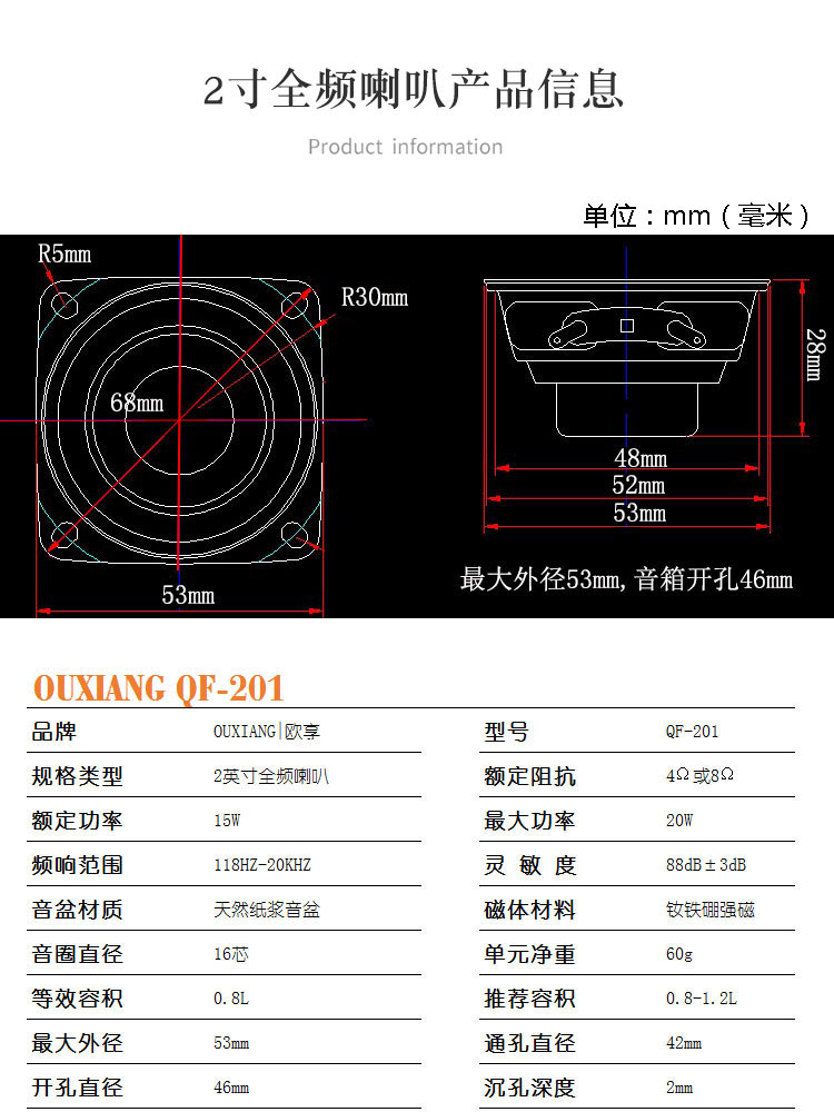 2-inch 53MM52mm Fever full-frequency horn 2-inch High power 4 Euro 8 Euro 15w VW neodymium magnetic horn speaker
