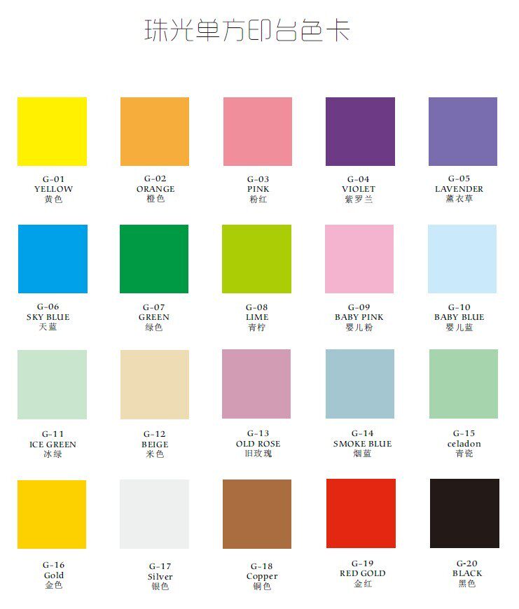 G-01Yellow G-02Orange G-03Pink G-04 Violet G-05Lavender G-06Sky blue G-07 Green G-08 Lilex G-09 Baby Powder G-1