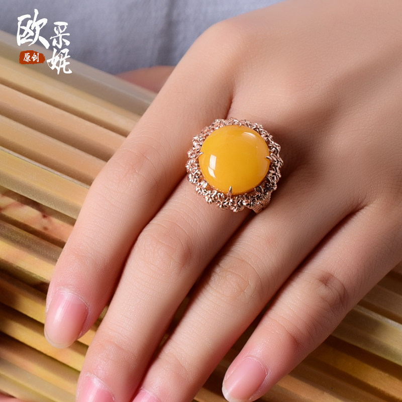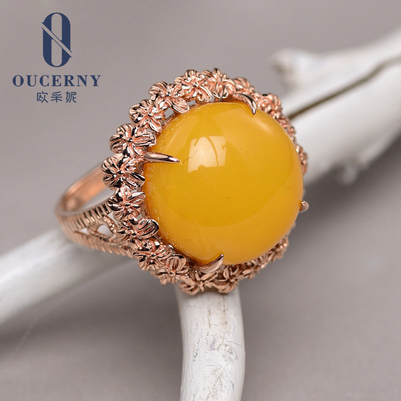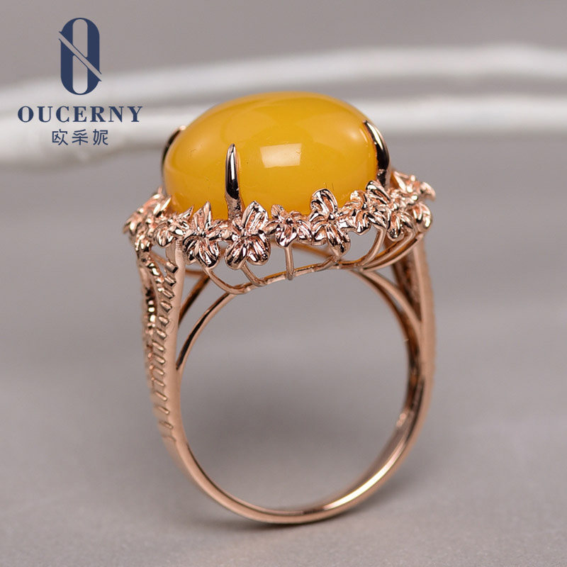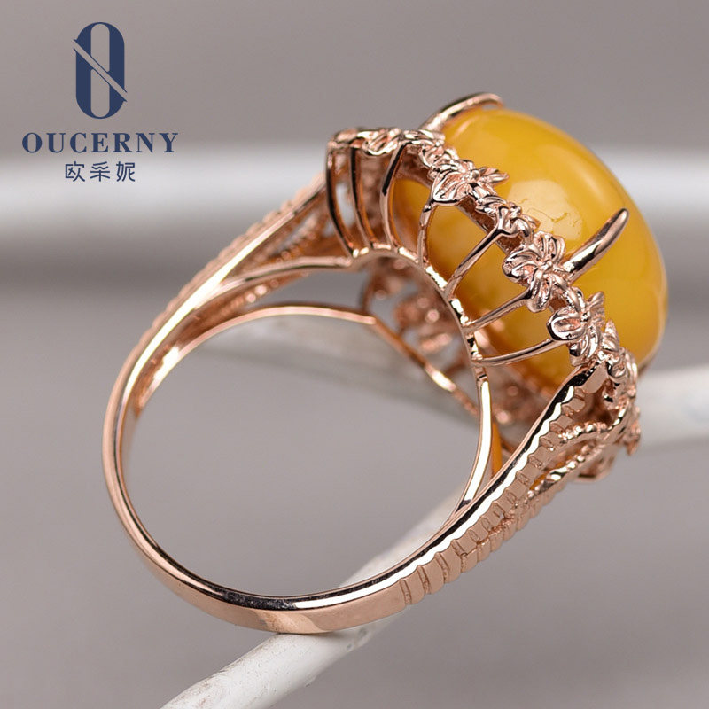 Ozeni Natural Baltic Amber Honey 18K gold inlaid Chanterelle yellow Beeswax ring Amber ring