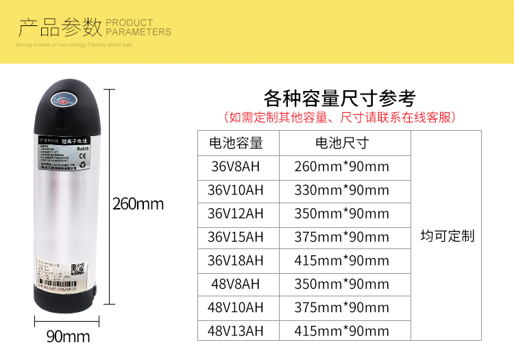 36V8AH (domestic battery cell) 36V10AH (domestic battery) 36V13AH (domestic battery) 36V15AH (domestic battery) 36V9.6AH (imported Panasonic) 36V12.8AH (imported Panasonic) 36V16AH (imported Panasonic) 36V19.2AH (imported Panasonic) 48V8AH ( Domestic battery) 48V10AH (domestic battery) 48V13AH (domestic battery) 48V9.6AH (imported Panasonic) 48V12.8AH (imported Panasonic) 48V16AH (imported Panasonic) 24V8AH (domestic battery) 24V10AH (domestic battery) 24V13AH (domestic battery) 24V15AH (domestic battery) 24V12.8AH (imported Panasonic) 24V16AH ( Imported Panasonic) 24V19.2AH (Imported Panasonic)