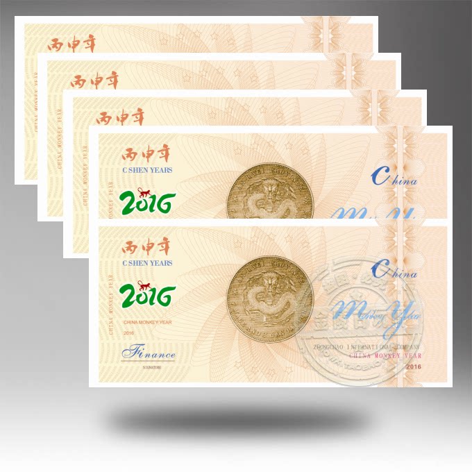 China 2016 Bing Shen Year Year of the Monkey test banknote Commemorative banknote engraved letterpress 5 sheets with the number of golden monkeys