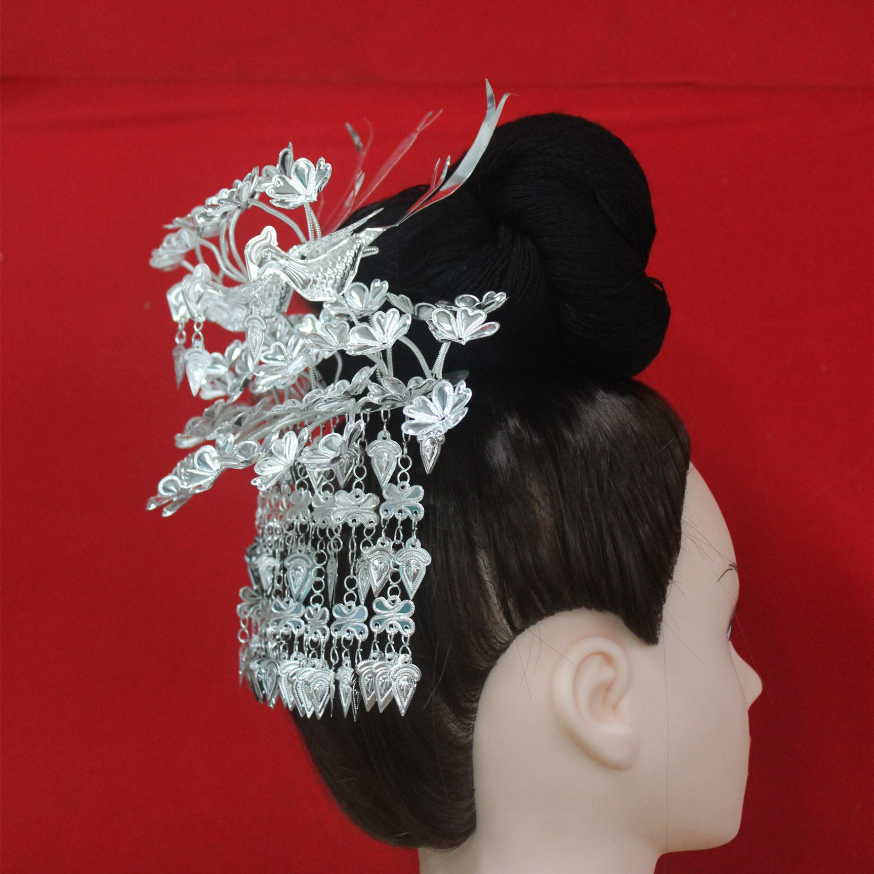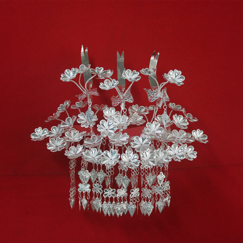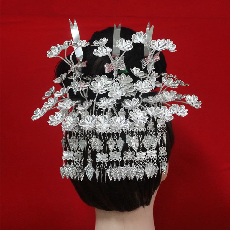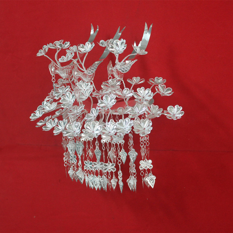 Hmong silver hat silver collar headdress Hmong new three birds multi-flower long string head pin