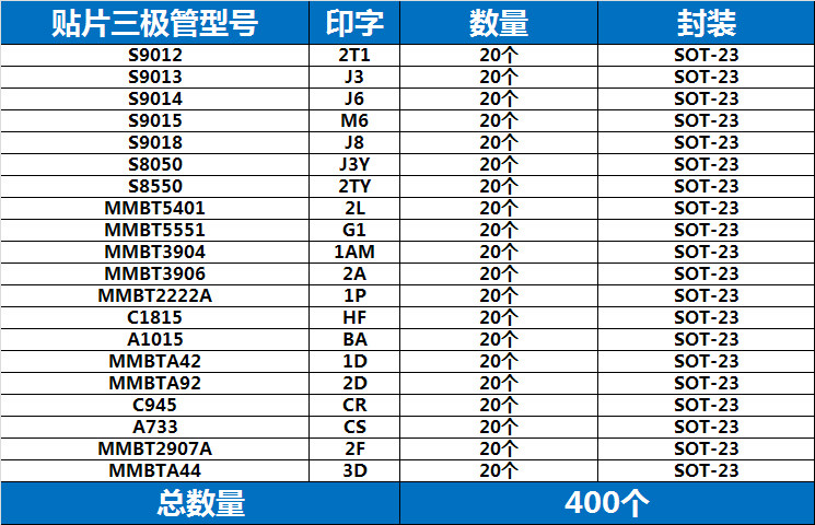 In-line low-power triode package 20 kinds of 20 each, a total of 400