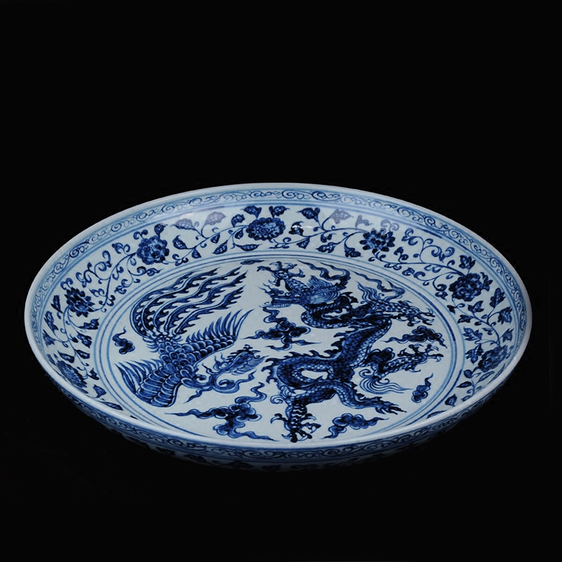 Antique Yuan Qinghua hand-painted dragon and phoenix porcelain plate wall hanging ornaments Jingdezhen ceramics vintage home decorations