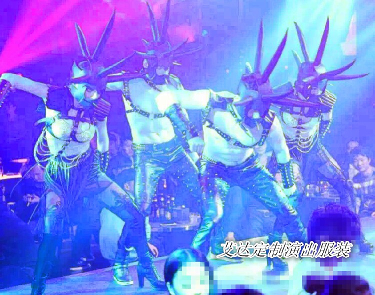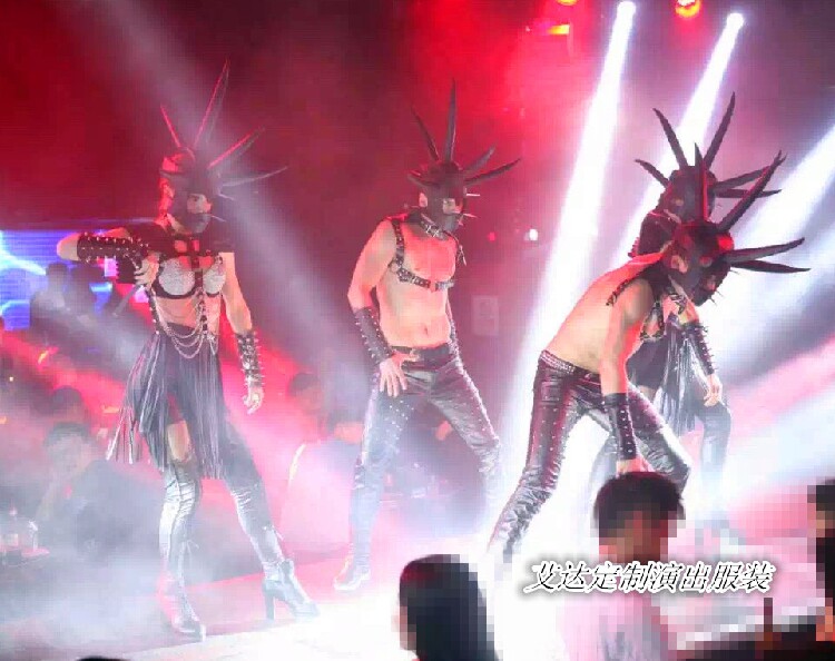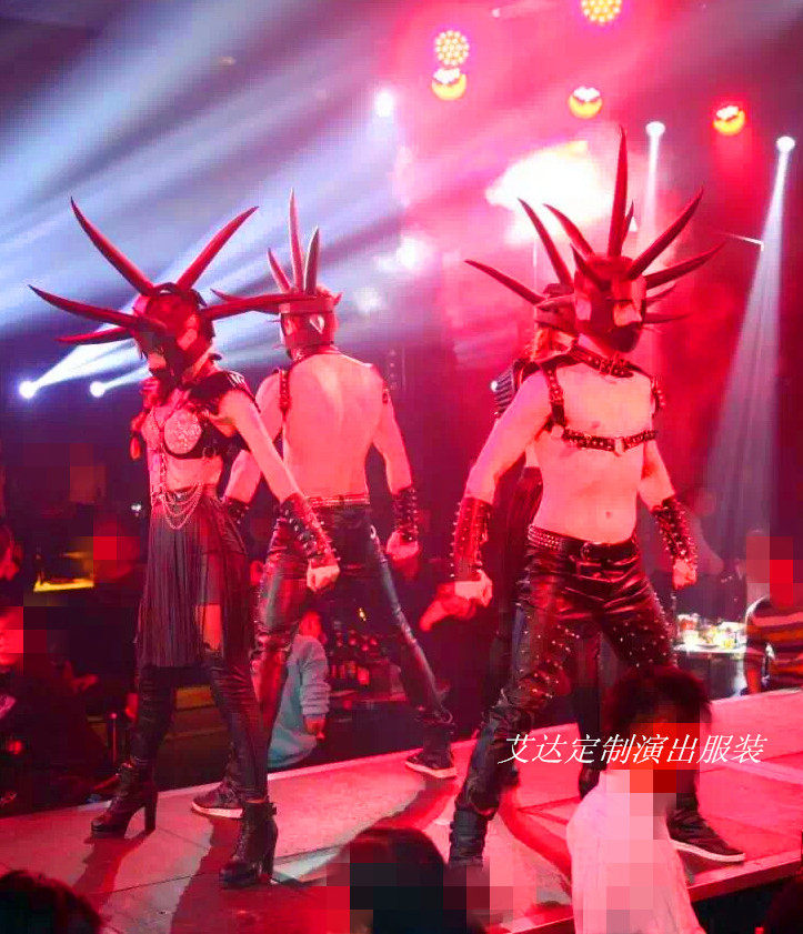 New bar nightclub DS party watches dance with exaggerated long rivet black leather head to play dress