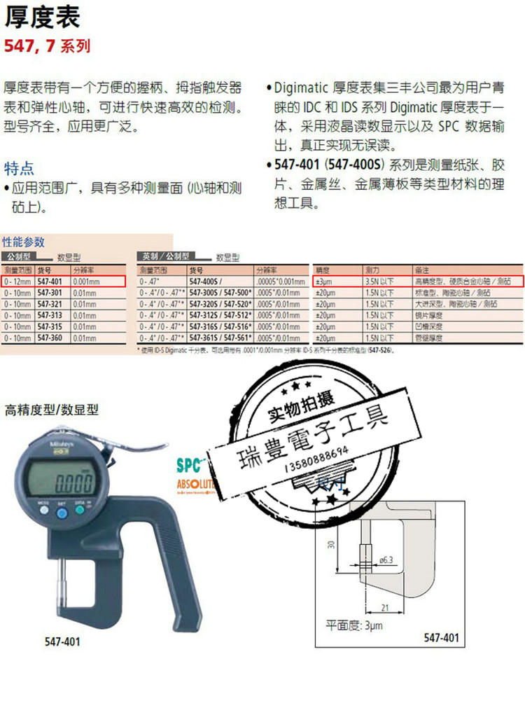 Japan's Sanfeng digital display thousand-point thickness gauge 547-401 film thickness gauge 0-12 7MM 0 001MM