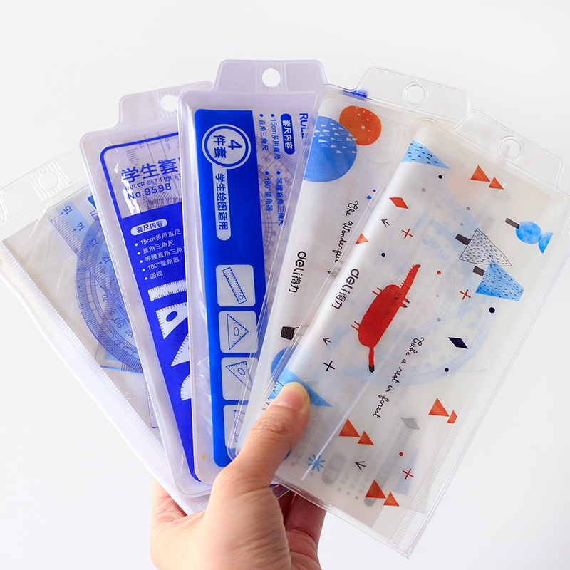 Deli ruler ruler triangle ruler Primary school stationery Korean simple grid ruler set ruler Multi-functional learning drawing drawing hand-drawn tool set Measuring transparent ruler 15cm protractor set ruler