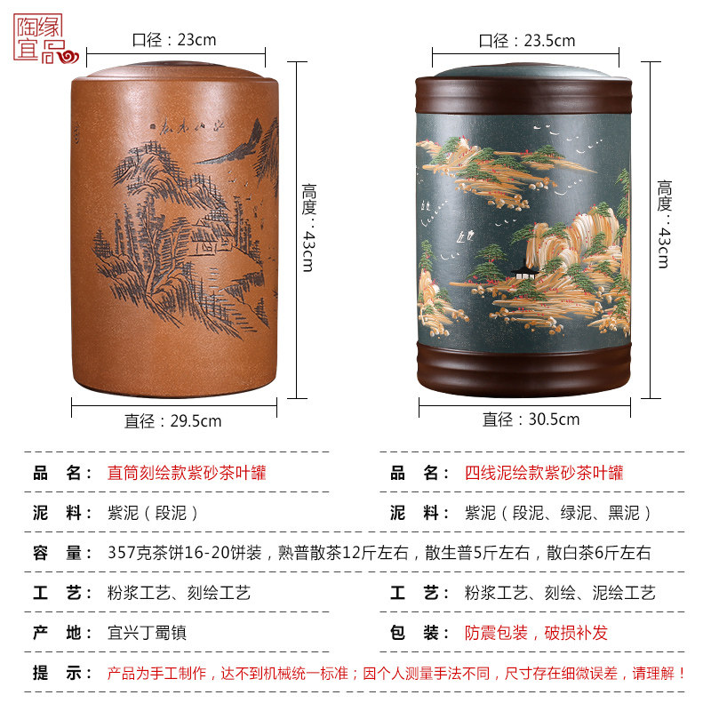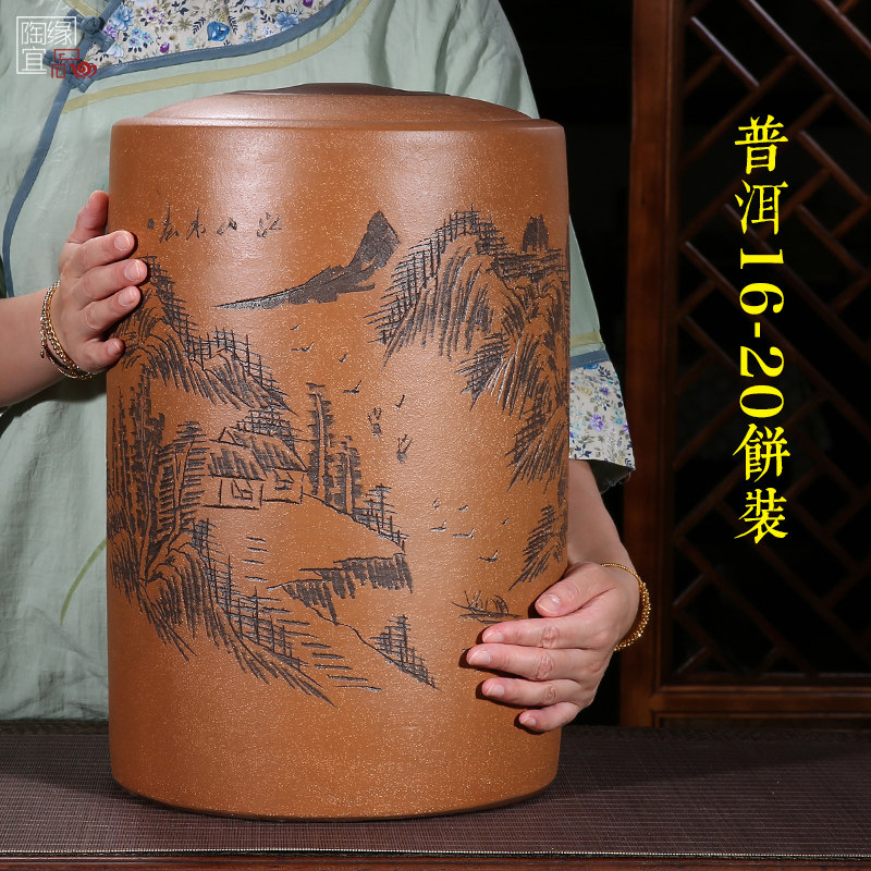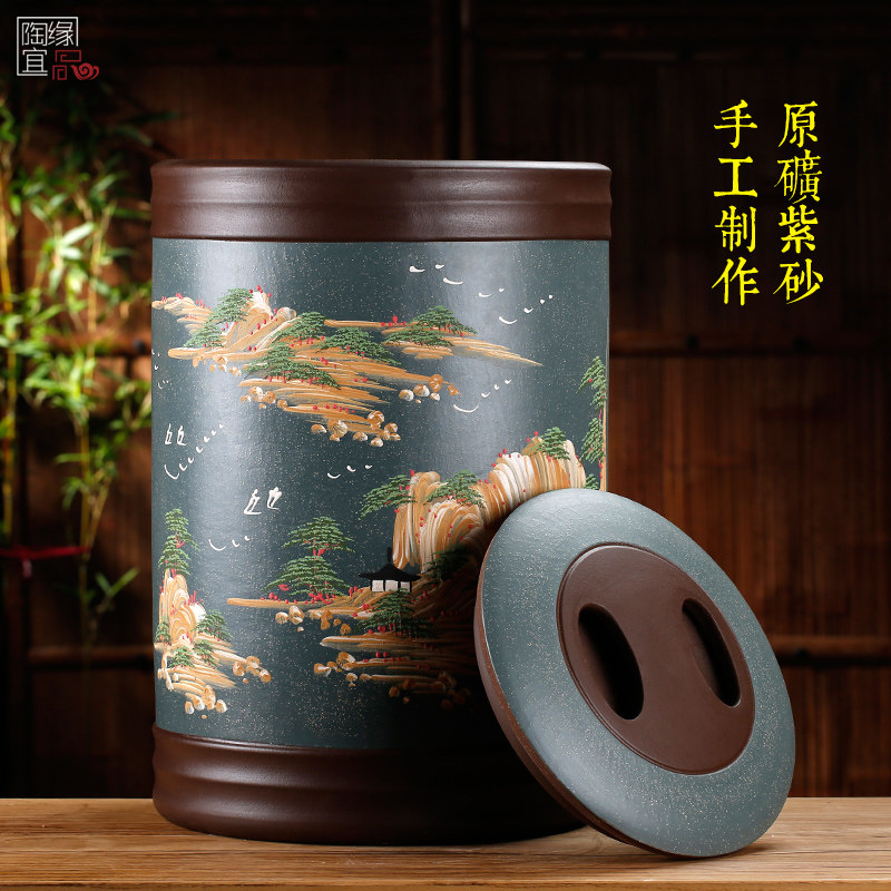 Yixing purple sand tea pot large hand-engraved sealed jar Pu'er tea jar ceramic storage jar home wake up tea jar