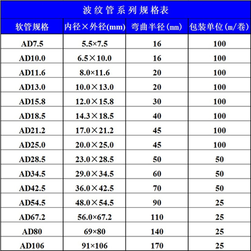 AD10 (internal diameter 6 5mm) 100 m AD11 6 (internal diameter 8mm) 100 m AD13 (internal diameter 10mm) 100 m AD15 8 (