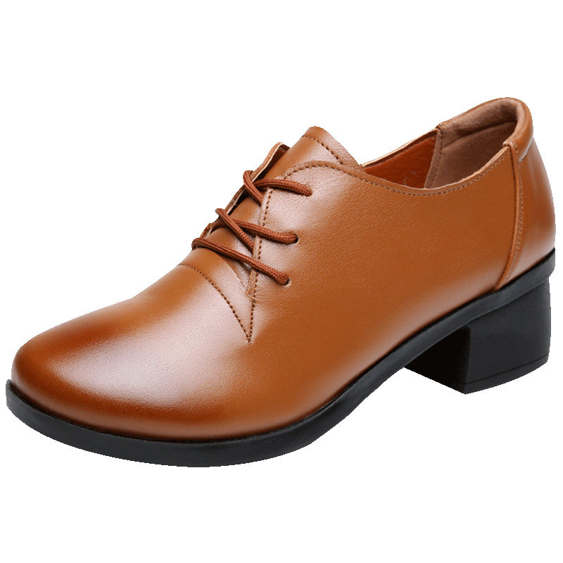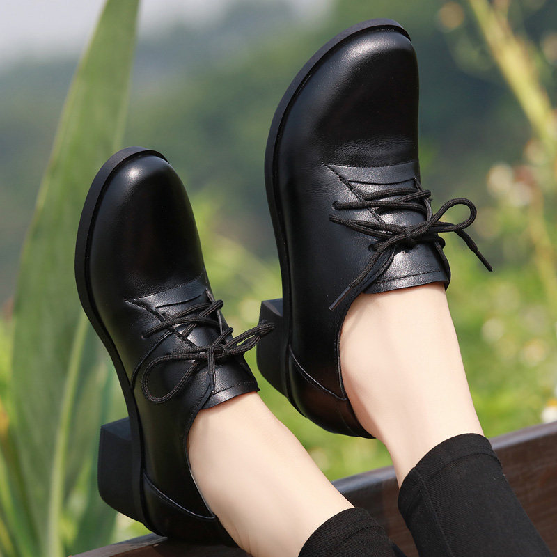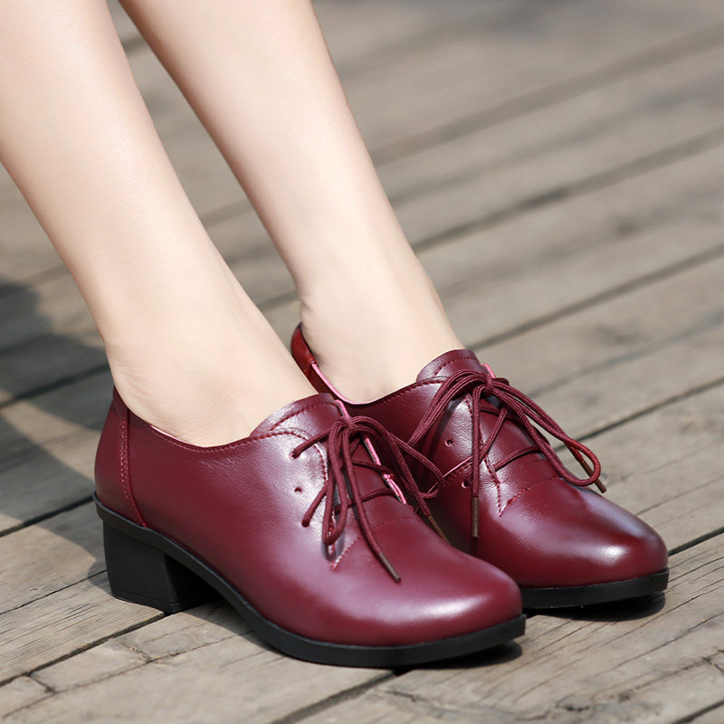 2023 New dermal deep mouth single shoes female coarse heel casual leather shoes and spring and autumn mother shoes in heel large number of women's shoes