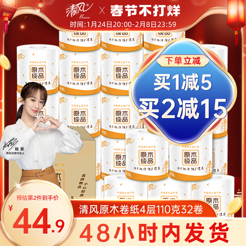 Qingfeng log pure roll toilet paper 4 layers 110g 32 rolls thickened and enlarged household sanitary toilet paper whole box flagship store