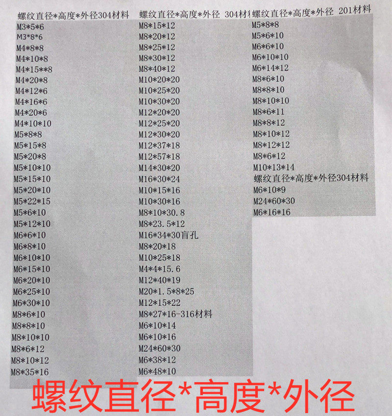 Rose red pink red blue blue watermelon red red khaki ginger yellow bright yellow apricot orange orange light yellow yellow golden champagne yellow milky white army green light green green fluorescent green sky blue sky blue blue lake blue navy blue dark purple brown coffee brown camel chocolate dark khaki flower color transparent black off-white orange red 304-M3 * 8 height * Ф6 outer diameter two 304-M4 * 10 height * Ф8 ( Two 304-M5*15 high*Ф10 (two) 304-M6*10 high*Ф10 (two) 304-M6*15 high*Ф10 (two)304-M6*20 high*Ф10 (two)304-M6*25 high*Ф10 (two)304-M6*30 high*Ф10 (two)304-M8*15 high*Ф12 (two) 304-M8*20 High*Ф12304-M8*25 High*Ф12304-M8*30 High*Ф12304-M8*40 High*Ф12304-M10*20 High*Ф20304-M10*25 High*Ф20304-M10*30*High Ф20304-M12*20 High*Ф20304-M12*25 High*Ф20304-M12*30 High*Ф20304-M14*30 High* Ф20304-M16*30 Height*Ф24 Customized Other Non-standard Inquiries 304-M8*10 High*Ф12 Dark Orange Red