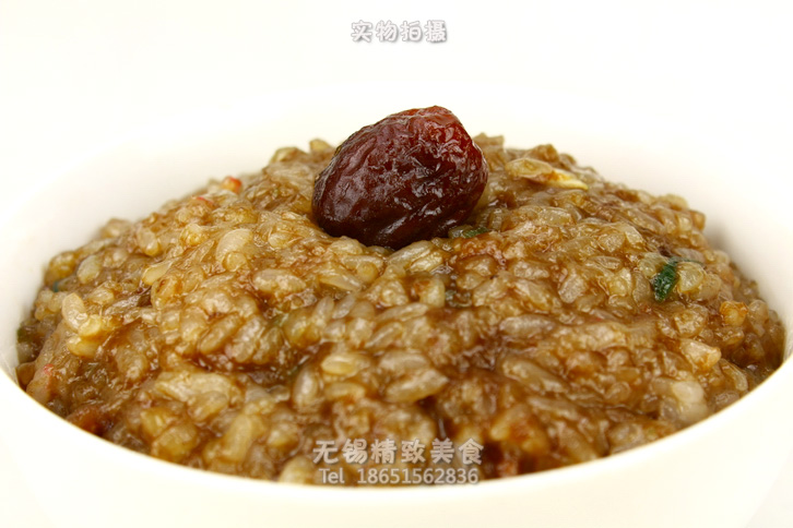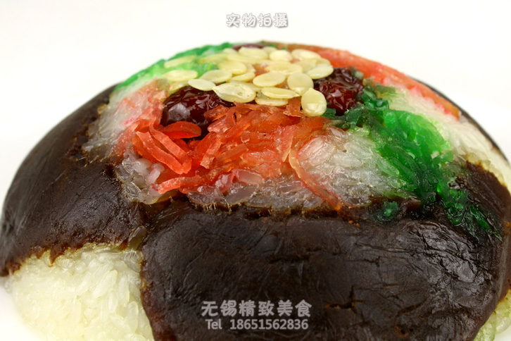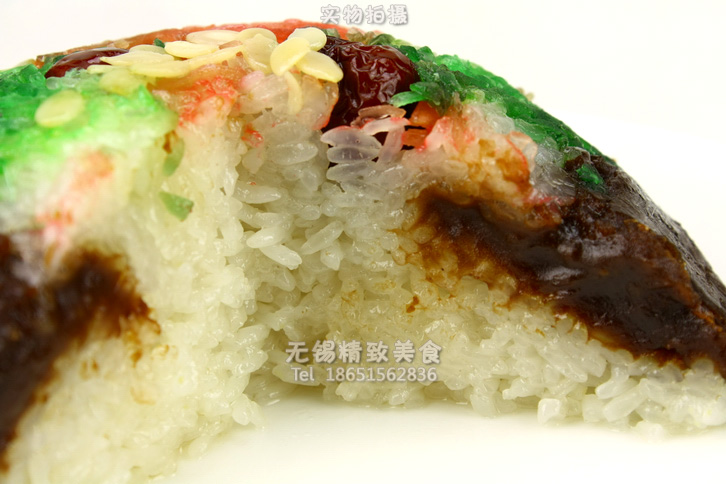 Glutinous rice, red bean paste, red and green silk (winter melon), sugar, melon seeds, red dates, lard