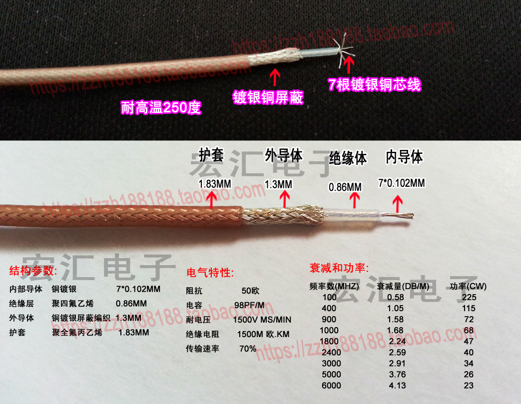 High temperature and high frequency coaxial cable SFF50-1 0-1 RG178 Teflon -1 0 single shield silver plated wire