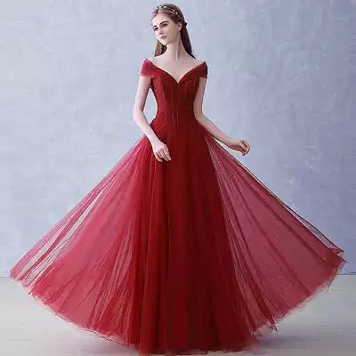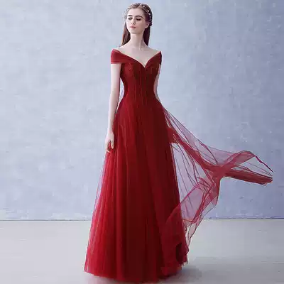2021 New Korean long version of wedding dress slim red shoulder dinner evening dress bride toast women