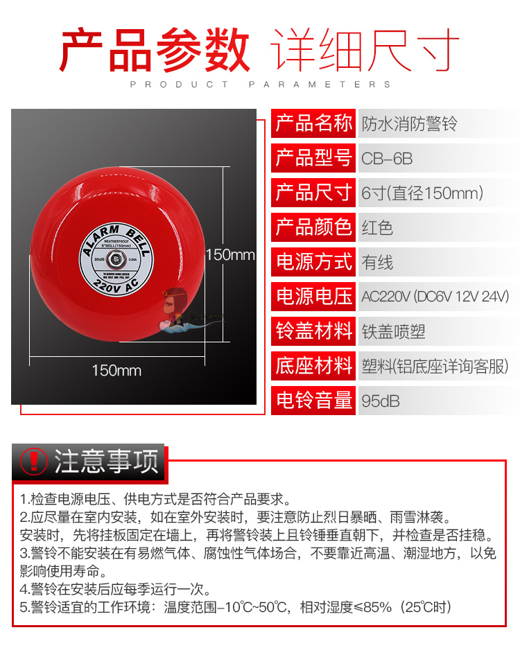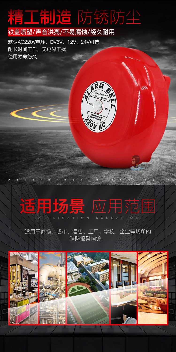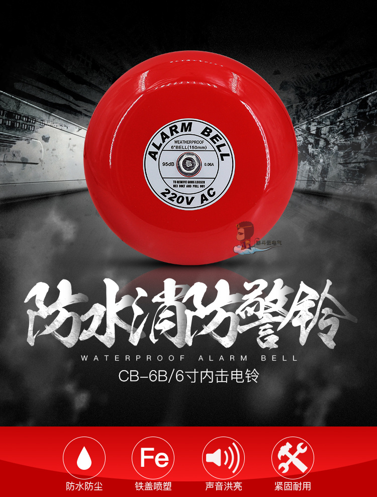 CB-6B fire alarm bell 6 inch outdoor waterproof electric bell outdoor manual alarm needs to be equipped with switch 24V12V220V