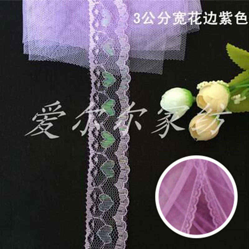 1 meter water green tent yarn 1 meter pink tent yarn 1 meter purple tent yarn 1 meter corn tent yarn 1 meter red tent yarn 1 meter white tent yarn 1 meter beige tent yarn 3 cm wide purple lace 4 meters 3 cm wide white