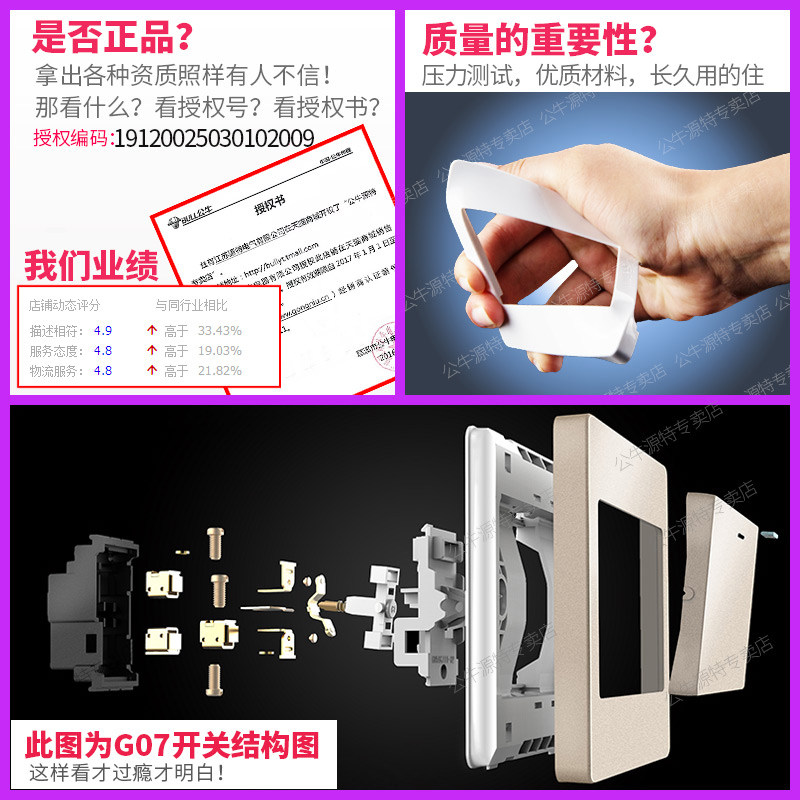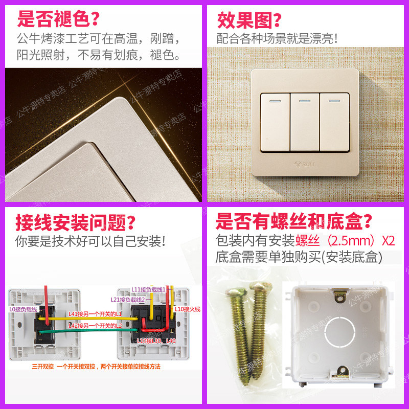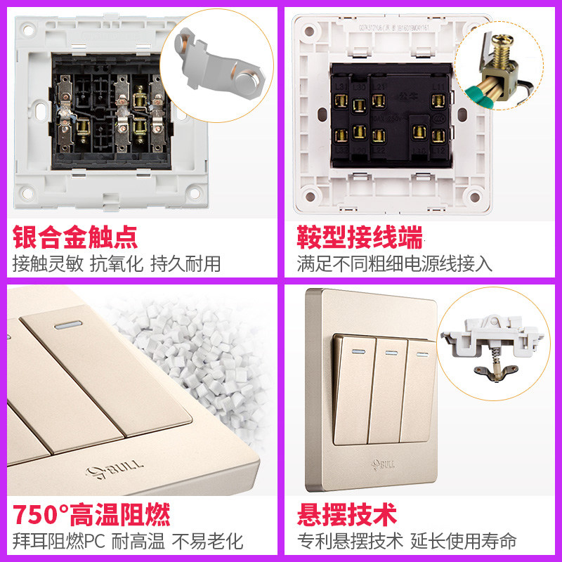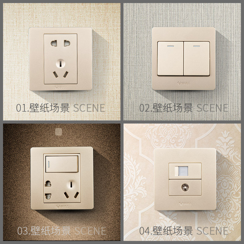 Bull wall concealed three-position double control 3 open two double-connected switch socket household power supply champagne gold 86 type panel