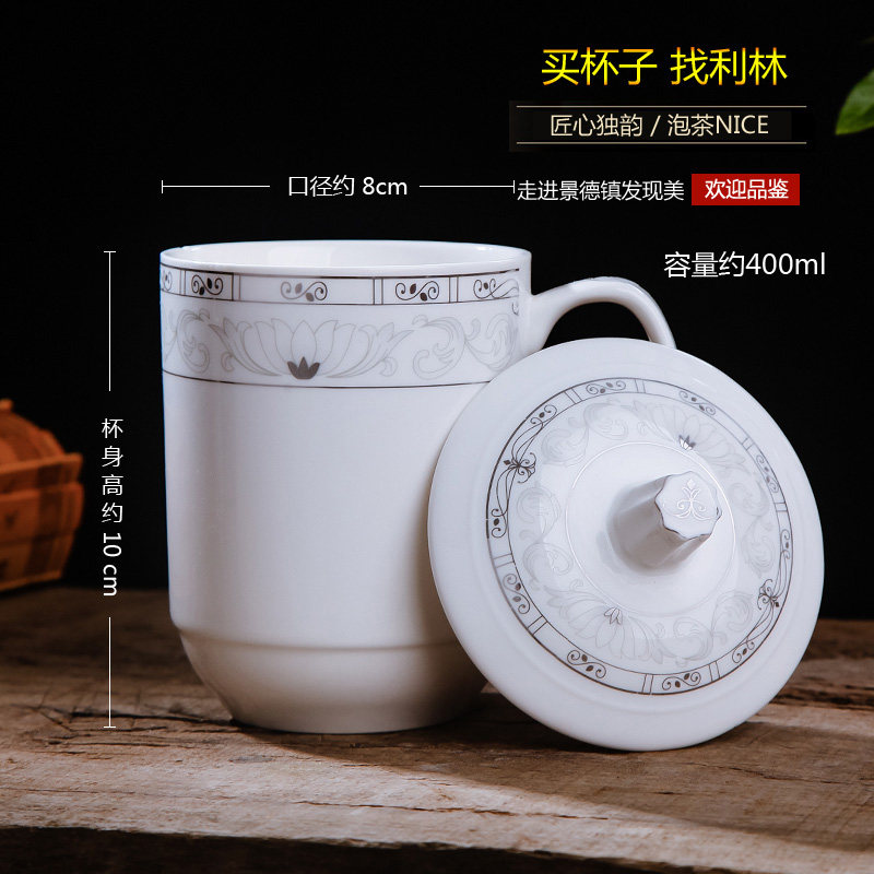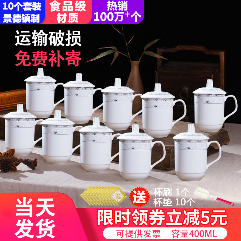 Jingdezhen teacup ceramic with lid Office conference cup Water cup Household hospitality tea bowl 10 sets customized