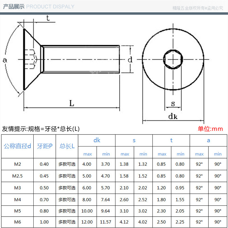Countersunk head socket screw DIN7991 stainless steel 304 flat cup machine tooth screw M5 * 8 10 12 16-40