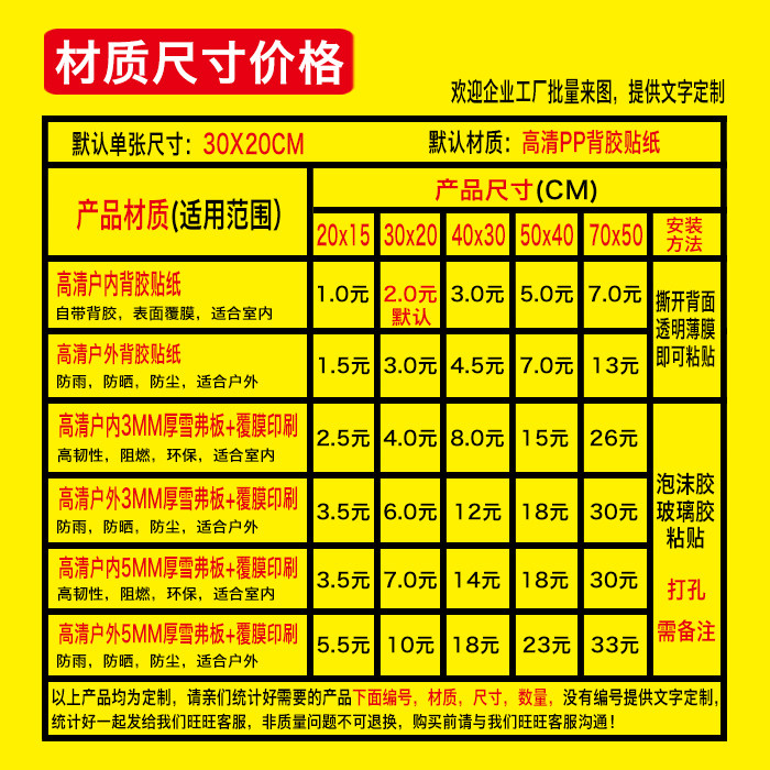 Indoor adhesive sticker Outdoor adhesive sticker Indoor 3MM Scheffer board PVC Outdoor 3MM Scheffer board PVC Indoor 5MM Scheffer board PVC Outdoor 5MM Scheffer board PVC