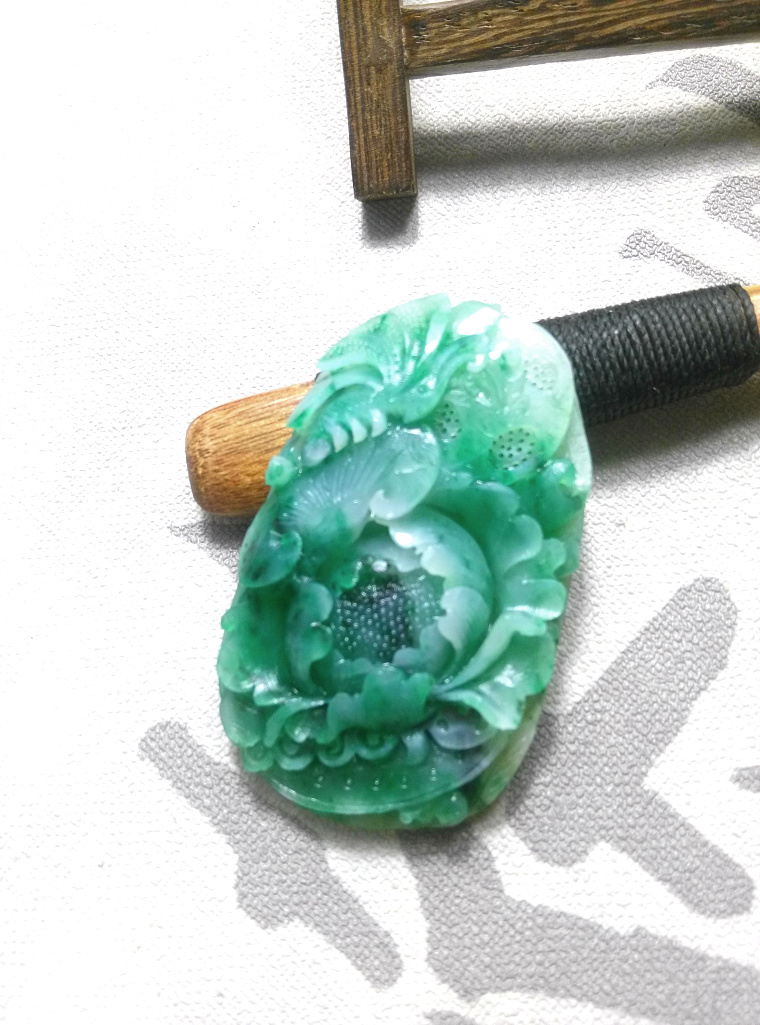 Already appreciated for the unique mountain jade daytime blue full green peony flowers open rich and expensive natural jade flowers with ruyi pendant