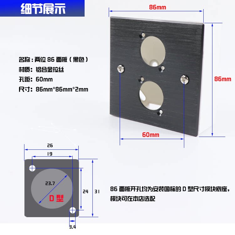 Two - hole black aluminum alloy anti - shield 86 black white shell 2 - bit D - shaped round - hole carnon wall