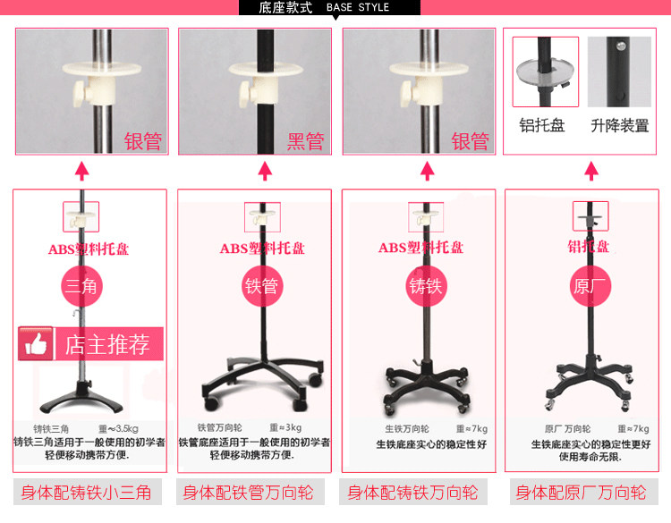 Model with iron pipe universal wheel base Model with cast iron triangle base Model with cast iron universal wheel base Model with original universal wheel base Model single body Note