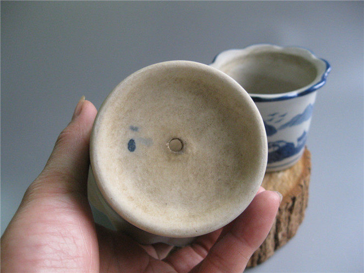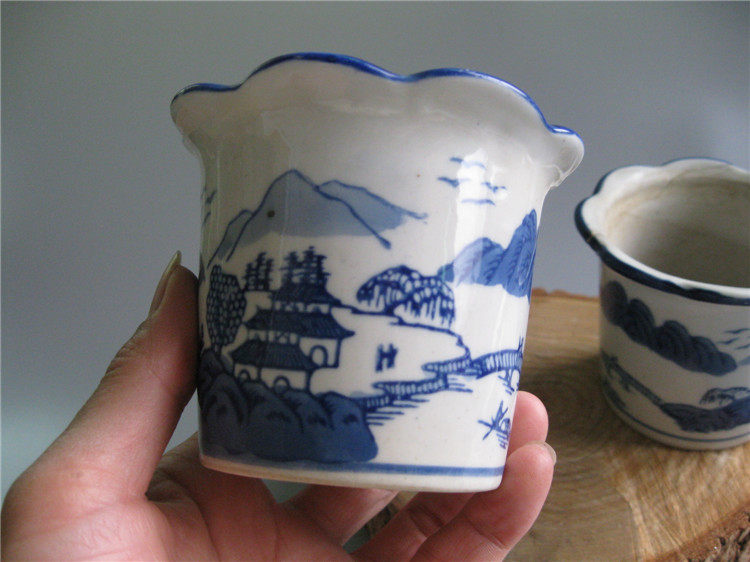 80's ceramic porcelain handmade blue and white landscape family pattern small flower pot old bonsai pot succulent pot pot retro