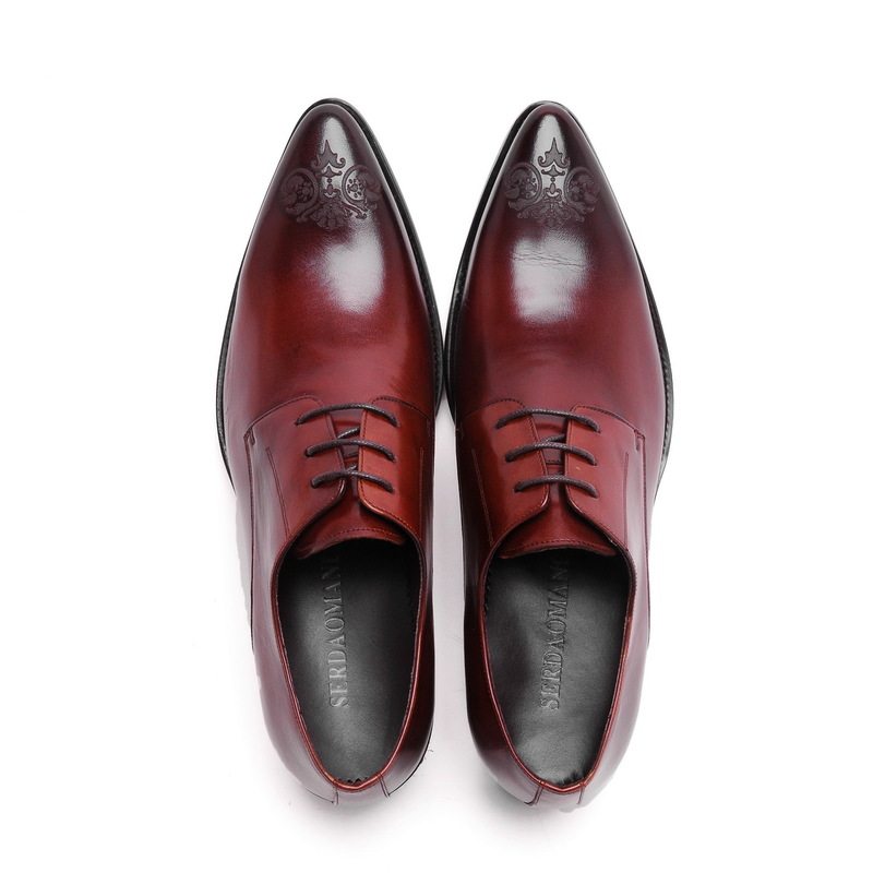 Men's models have extra high school heels, formal wear, business pointed leather shoes, male groom's wedding carved lace, British wine red