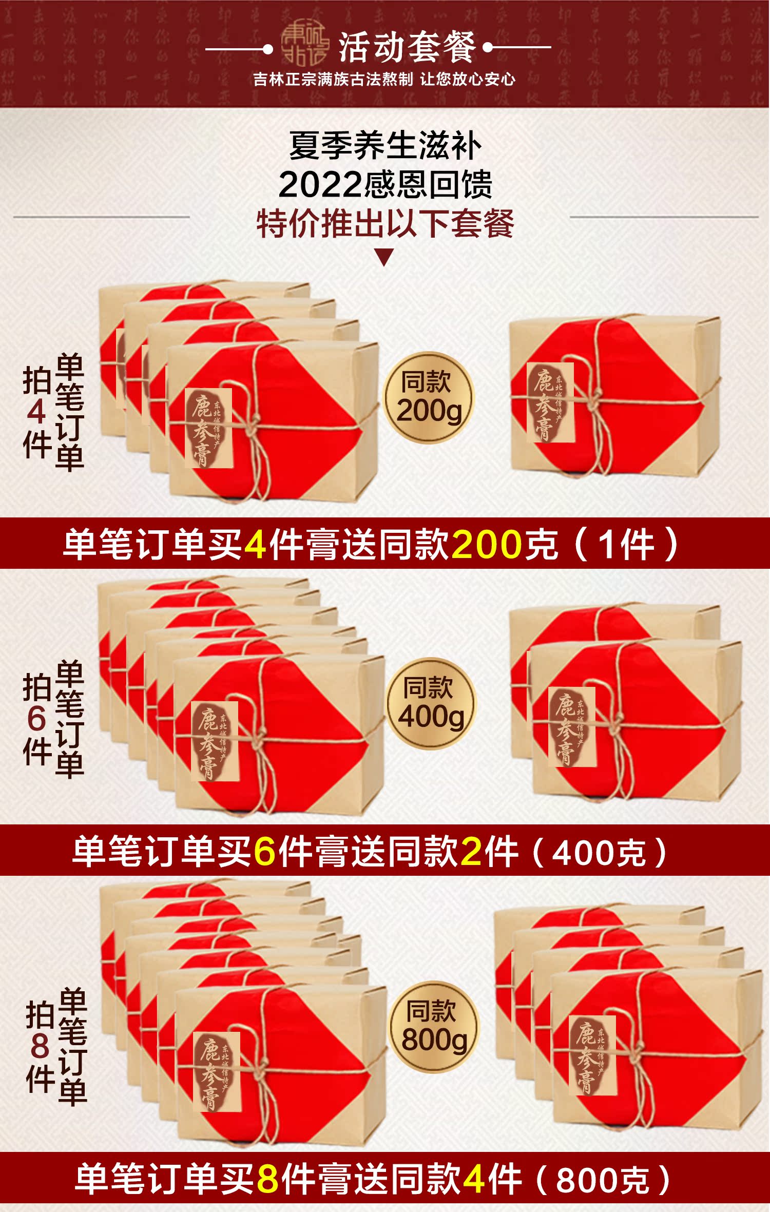 Venison, deer skin, deer blood, ginseng (artificially planted 4 or 5 years old sun-dried ginseng), honey, brown sugar, yam, wolfberry, cumin, etc.