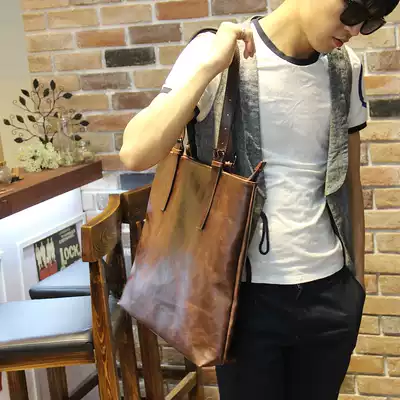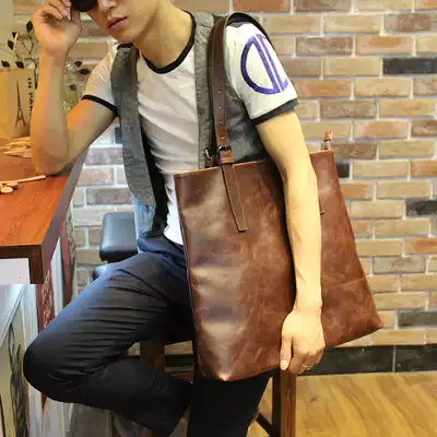 New leather satchel men's Korean version of the popular men's bag street trend fashion shoulder bag vertical handbag large bag