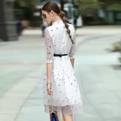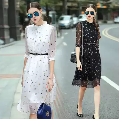 Women's fashion star print fake two piece collar A- line dress summer tide 2019 early season new silk dress G