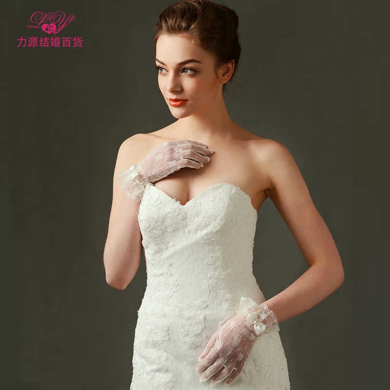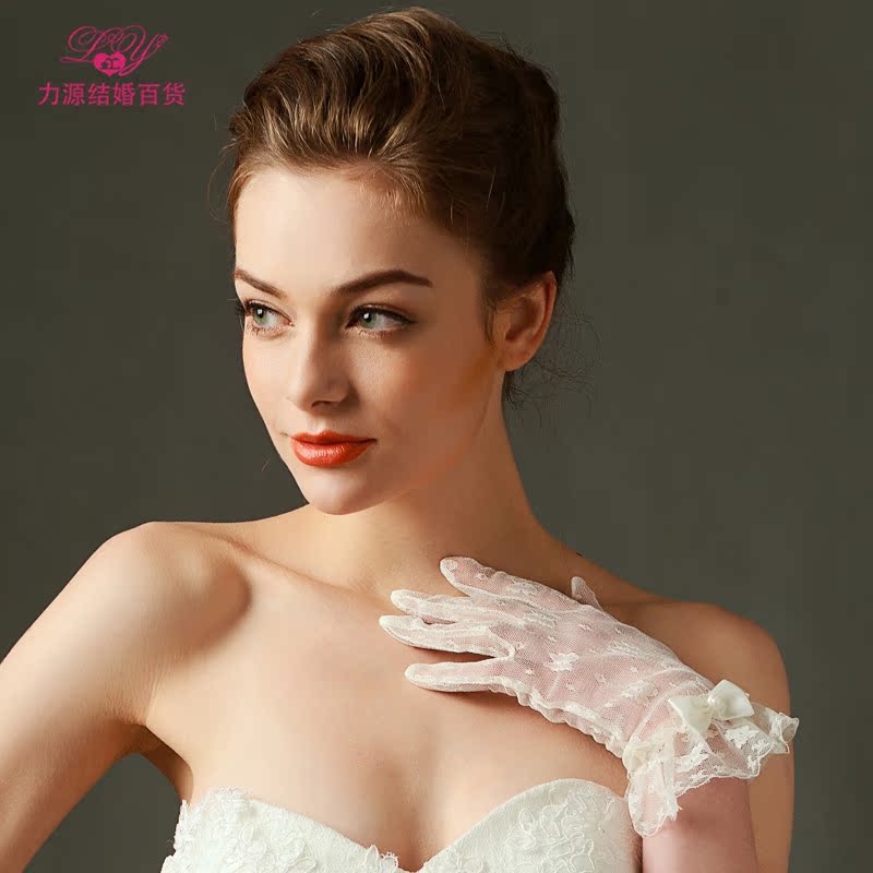 Liyuan factory direct sale special bow bride wedding gloves short lace beige wedding accessories summer