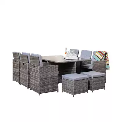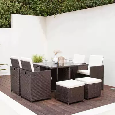 Steel frame one table, four chairs with padded aluminum frame, one table, four chairs with padded steel frame, one table, four chairs, four benches, one table, four chairs, four benches, one table, four benches, one table, six chairs, one table, and one table, six chairs, the padded aluminum frame one table, six chairs with padded steel frame, one table, six chairs, four stools