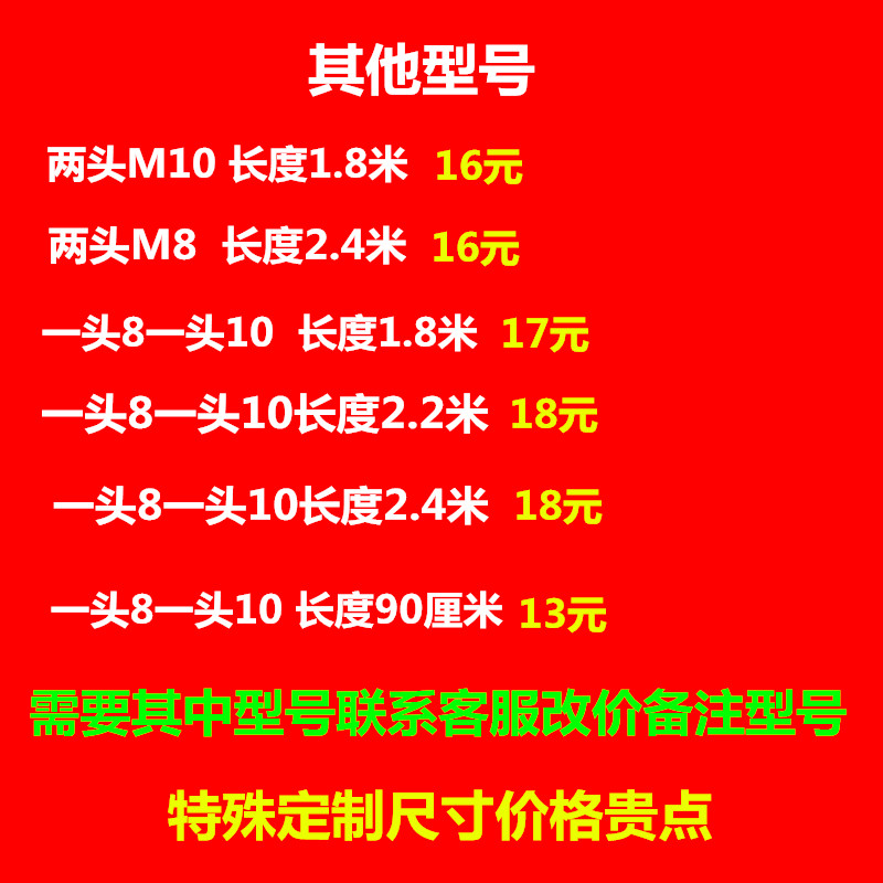 Two ends 10mm holes (1 meter) Two ends 8mm holes (1 meter) One end 8mm and one head 10mm (1 meter) One end 8mm and one head 10 (1.2 meters) Two ends 10mm holes (1.2 meters) Two ends 8mm holes (1.2 meters) One end 8mm and one head 10mm (2.1 meters) Two heads 10mm holes (2.1 meters) Two ends 8mm holes (2.1 meters) Two heads 10mm holes (2.4 meters) One end 8mm one head 10mm (2.2 meters) Two heads 10mm holes (2.2 meters) Two heads 8mm holes ( 2.5 m) Two heads 8mm (1.6 m) Two heads 10mm holes (30 cm) Two heads 10mm (90 cm) Two heads 8mm (90 cm) Two heads 10mm holes (2.5 meters) Two heads 10mm holes (50 cm) Two heads 10mm (2 meters) Two heads 8mm (2 meters) Two heads 10mm holes (80 cm) Two heads 10mm holes (1.9 meters) Two heads 8mm holes (1.8 meters)
