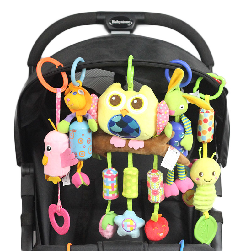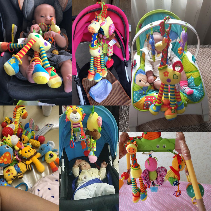 Monkey-with wind chimes and paper rings Large giraffe-with music Ladybug-with wind chimes Lion-with wind chimes Green rabbit-with wind chimes and paper Yellow baby elephant-with wind chimes Butterfly