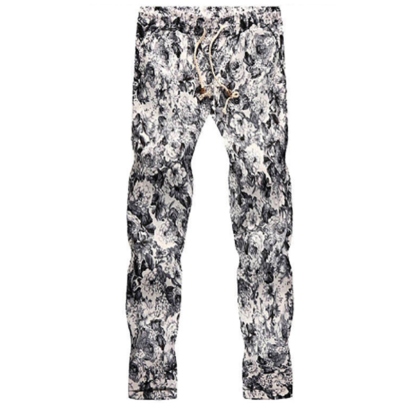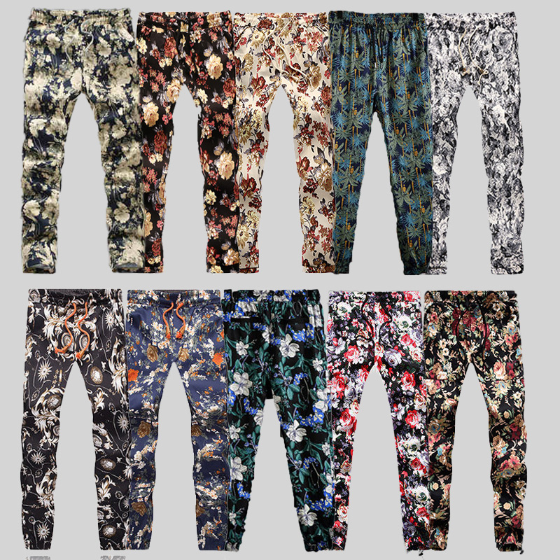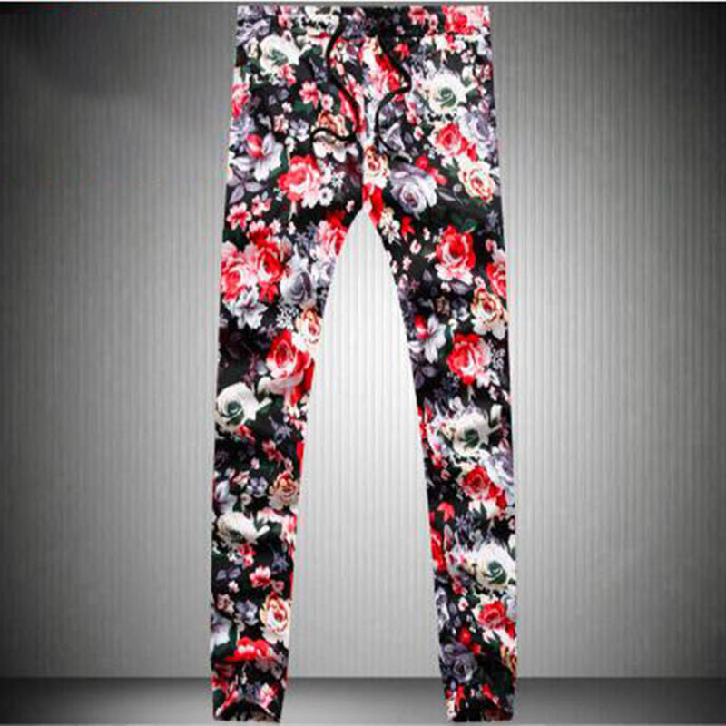 Autumn personalized color pants men's printed casual pants trendy small feet fancy floral elastic trousers performance style